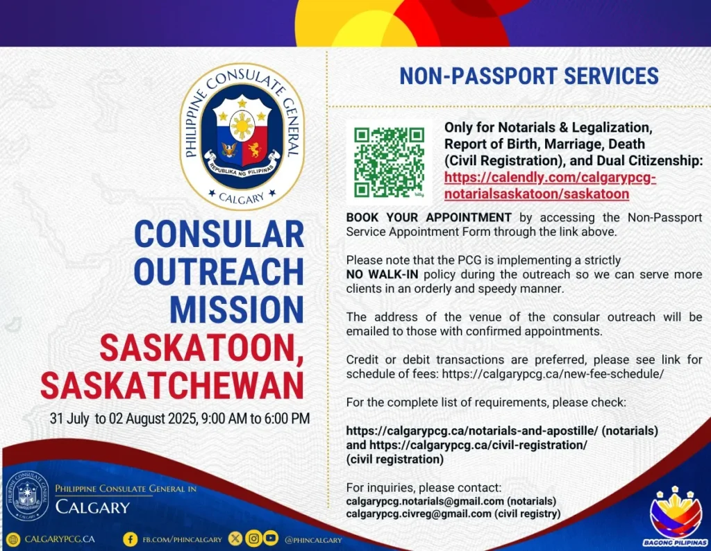 The @Philippine Consulate General in Calgary will conduct a Consular Outreach Mission in Saskatoon, Saskatchewan on 31 July to 02 August 2025, 9:00am to 6:00pm.
