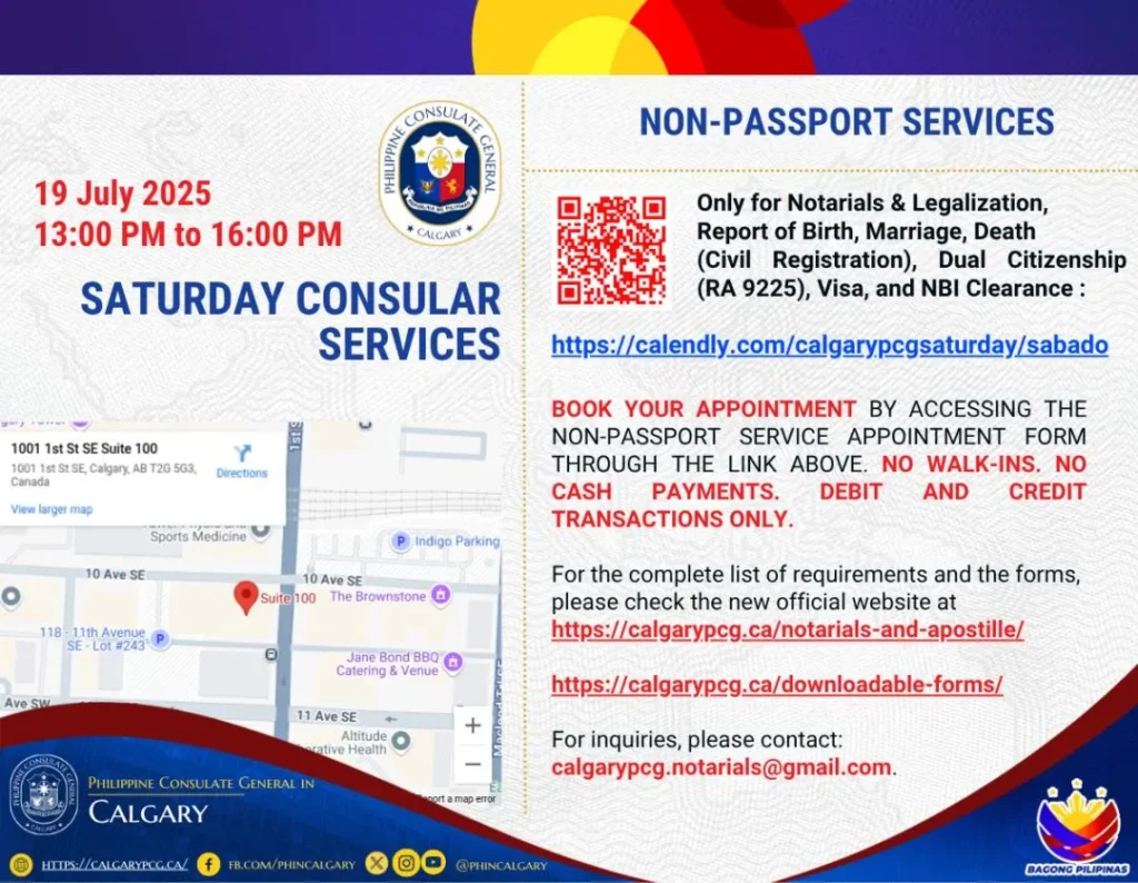 The Philippine Consulate General in Calgary will conduct a Saturday Consular Services on 19 July 2025, 1:00 to 4:00pm.